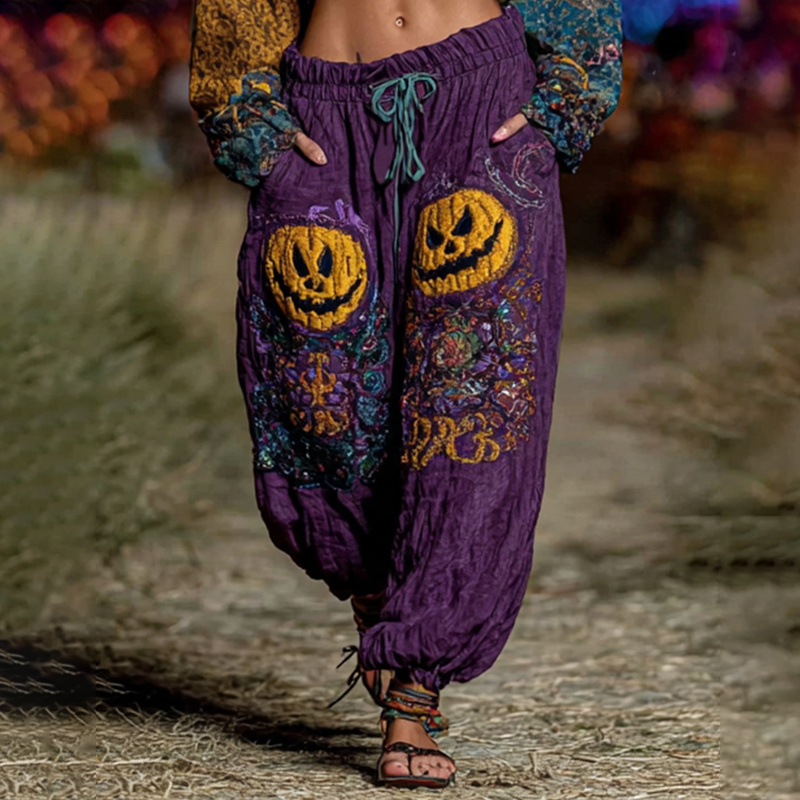 Bohemian Halloween Themed Pumpkin Embroidered Linen Pants