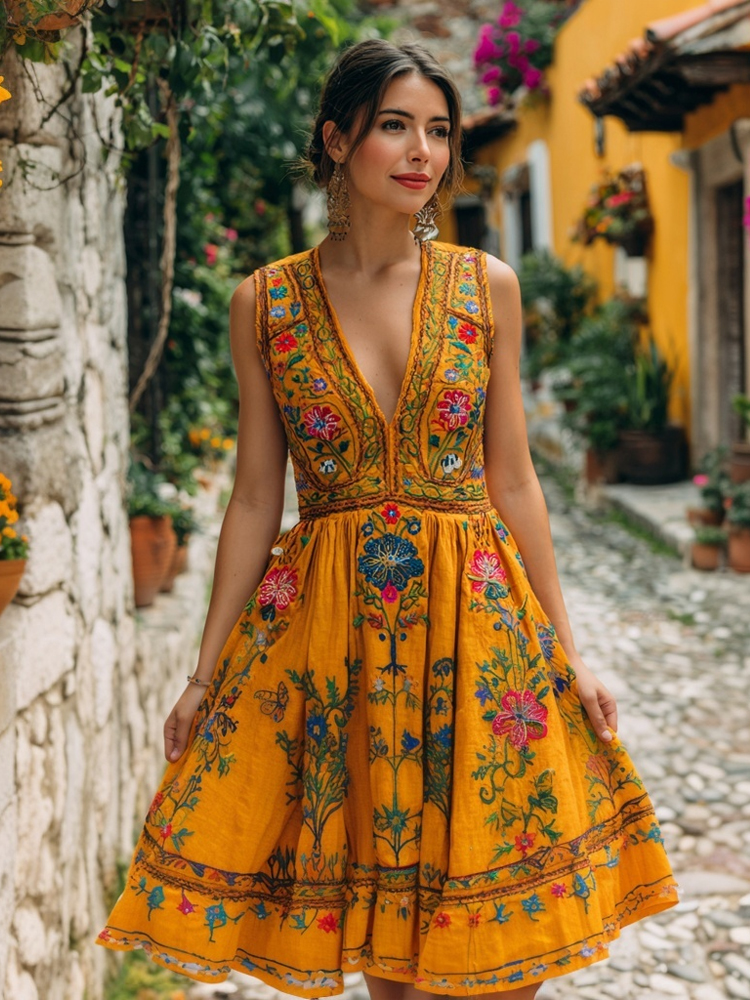 Day Of The Dead Mexican Flowers Embroidered Linen Midi Dress