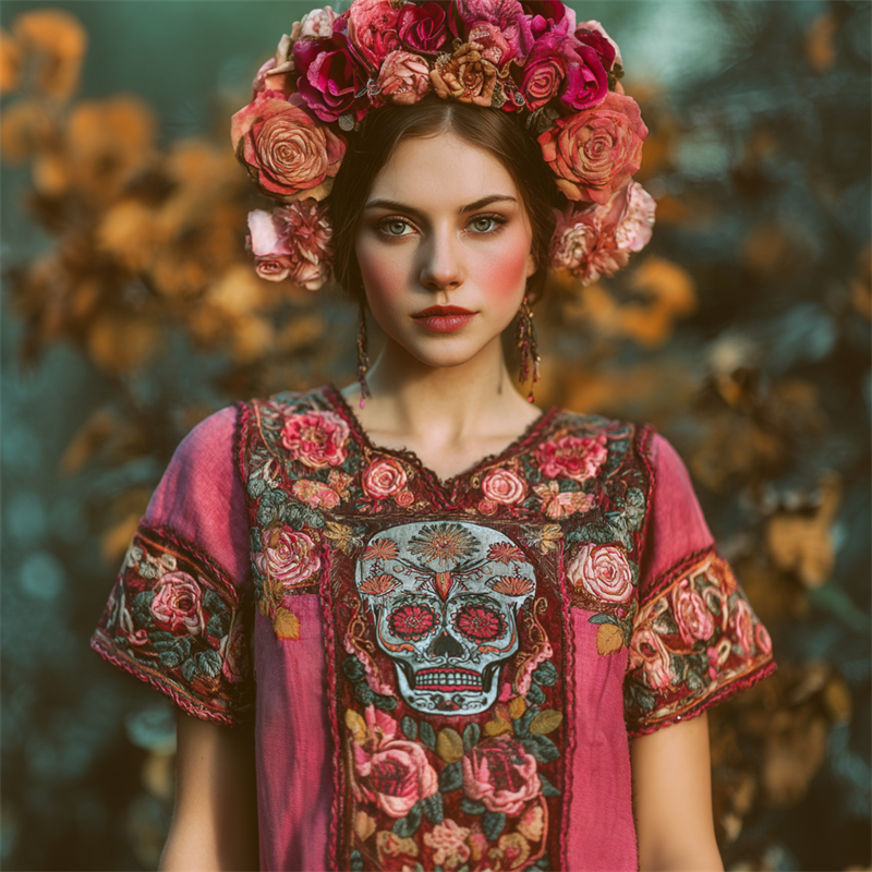 Day Of The Dead Sugar Skull Roses Floral Embroidered Contrast Linen Shirt