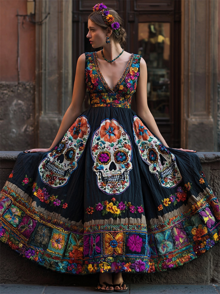 Day Of The Dead Sugar Skulls Mexican Floral Embroidered Linen Maxi Dress