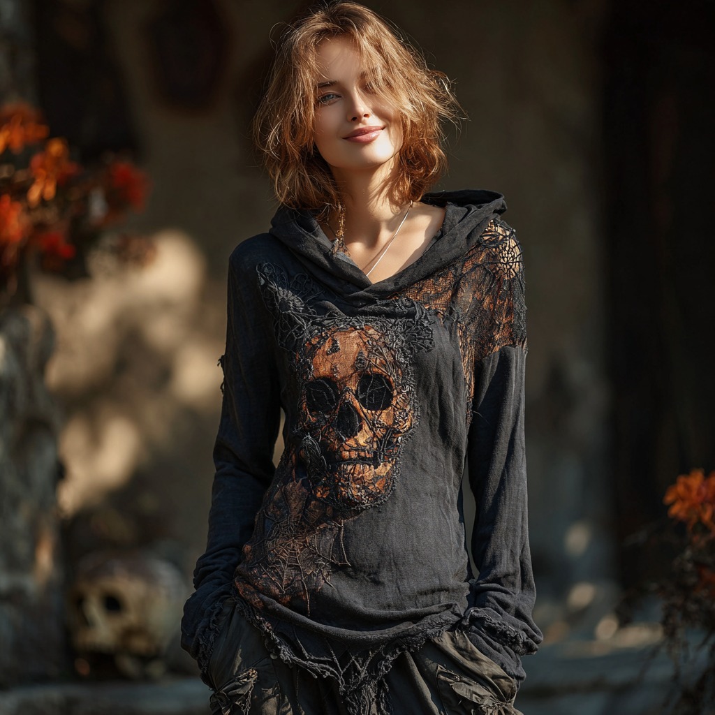 Halloween Dark Skull And Spider Web Pattern Women's Hooded T-shirt