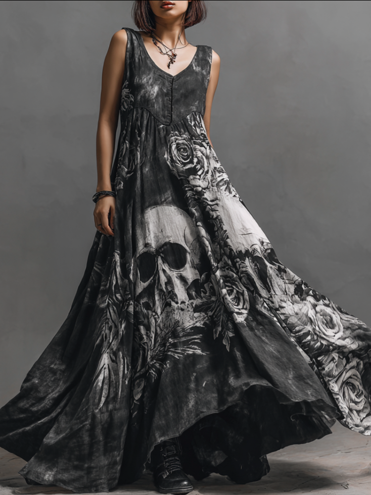 Halloween Gothic Skull Pattern Women's V-neck Long Dress