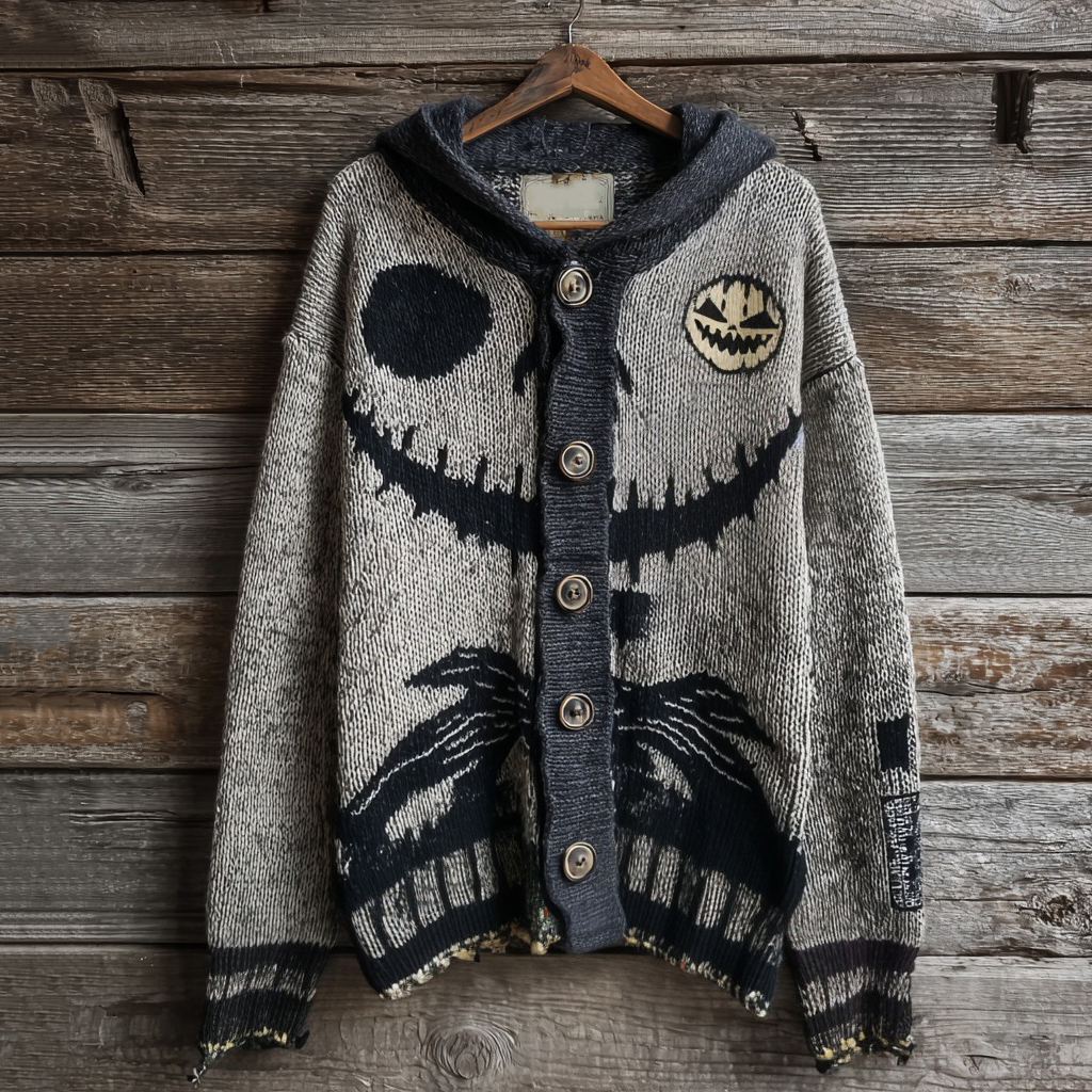 Halloween Spooky Face Contrast Stitching Cozy Knitted Hooded Sweater Cardigan