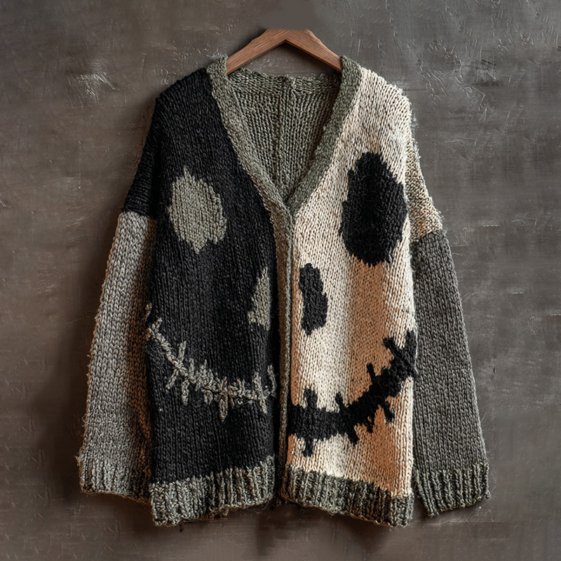 Halloween Spooky Face Contrast Stitching Cozy Knitted Sweater Cardigan