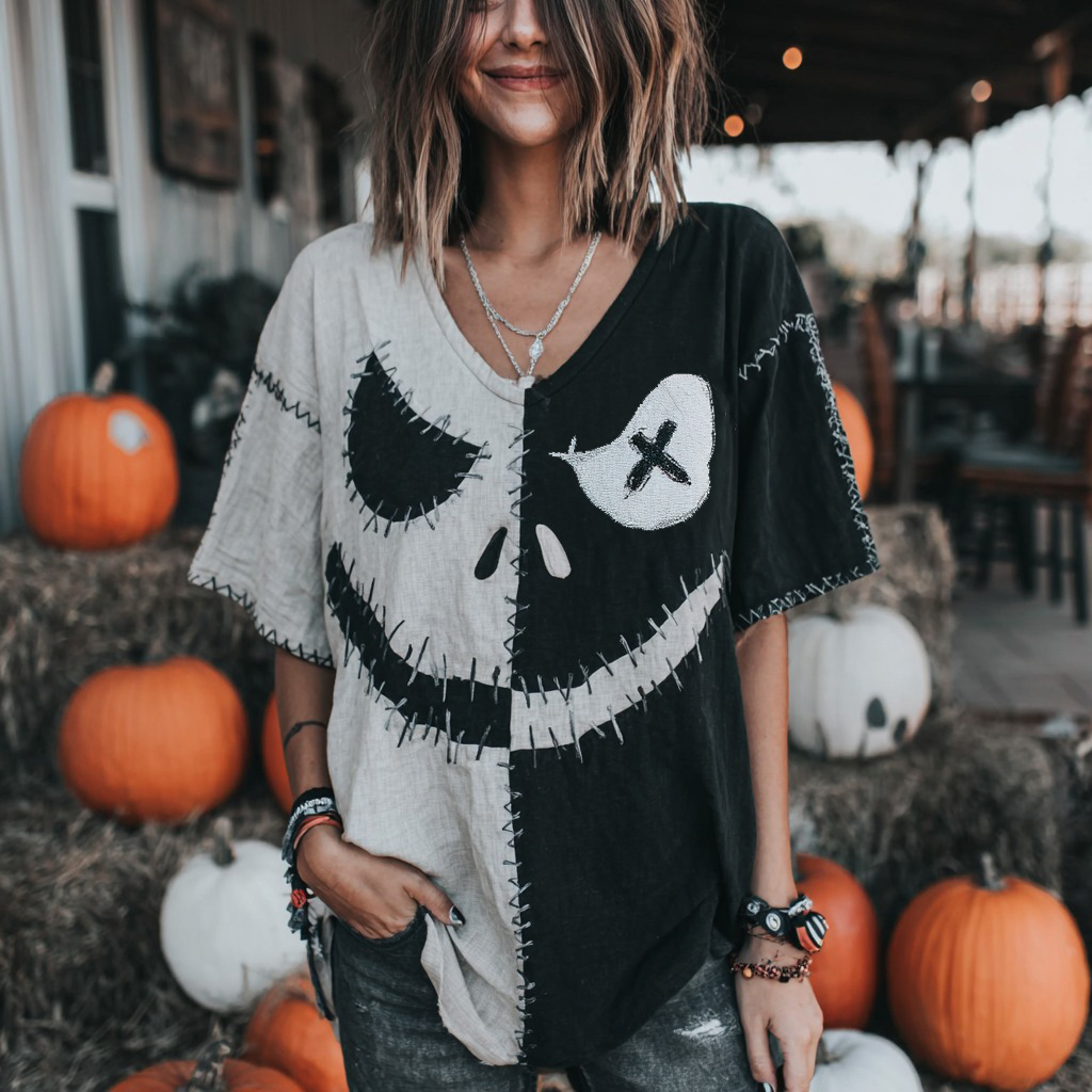 Halloween Spooky Face Pattern Casual Linen V-neck T-shirt