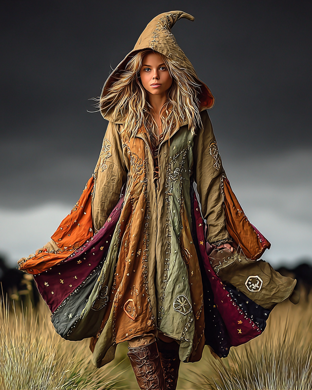 Star And Moon Themed Embroidery Contrast Patchwork Hooded Witch Dress 7cee