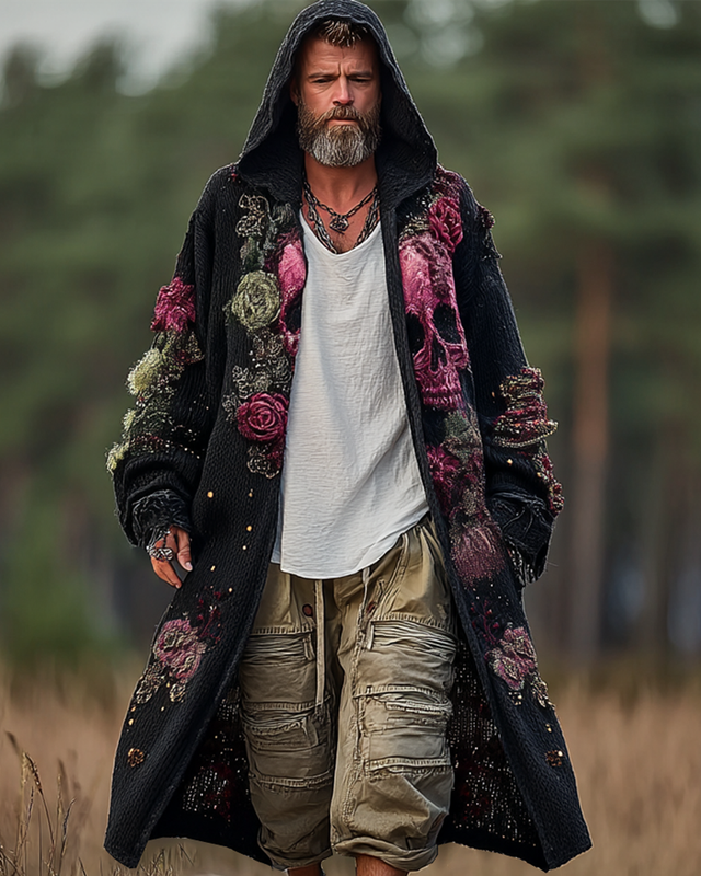 Men's casual and comfortable Halloween theme skull floral 3D embroidered linen kaftan-style hooded robe 042d