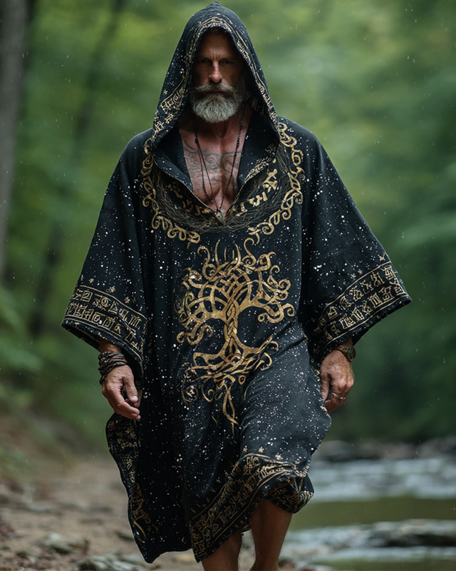 Men's Viking Tree of Life Celtic Woven 3D Embroidered Hooded Kaftan 14a6