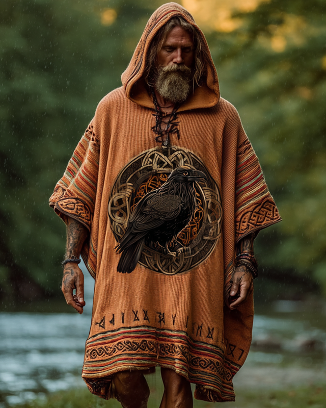 Men's Viking Raven Celtic Woven 3D Embroidered Knitted Hooded Kaftan 9698