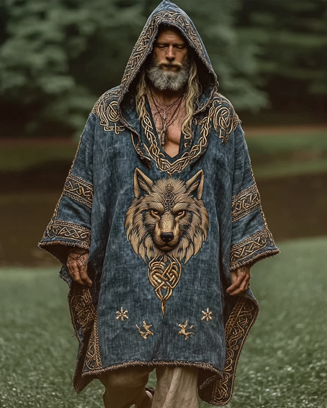 Men's Viking Kettle woven wolf totem 3D embroidered hooded kaftan f3b0