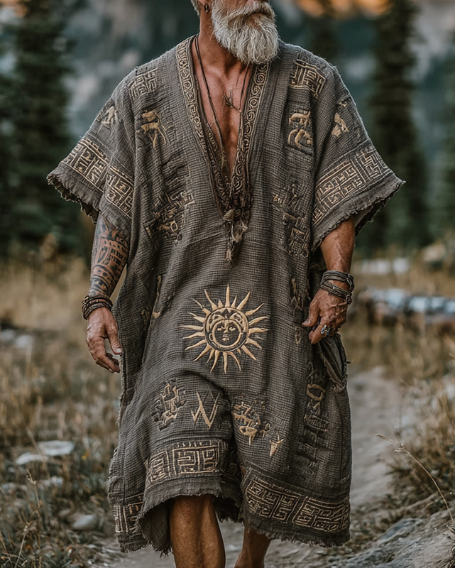 Men's casual and comfortable star and moon 3D embroidered linen Kaftan 5a84