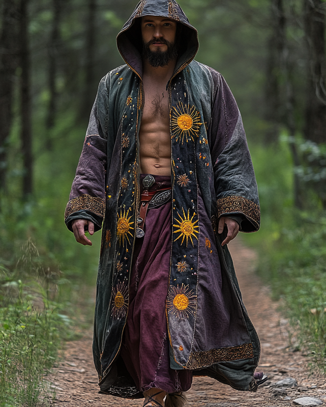 Men's casual and comfortable star and moon 3D embroidery contrast color stitching linen hooded Kaftan de68