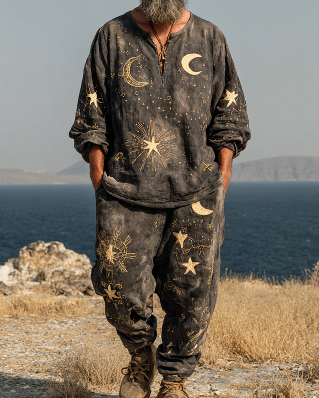 Men's Casual Star and Moon Embroidery Long Sleeve Top & Pants Two-piece Set 9247