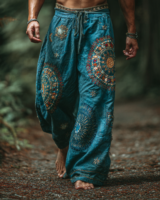 Men's Casual Halloween Theme Skull 3D Embroidered Linen Trousers ba00