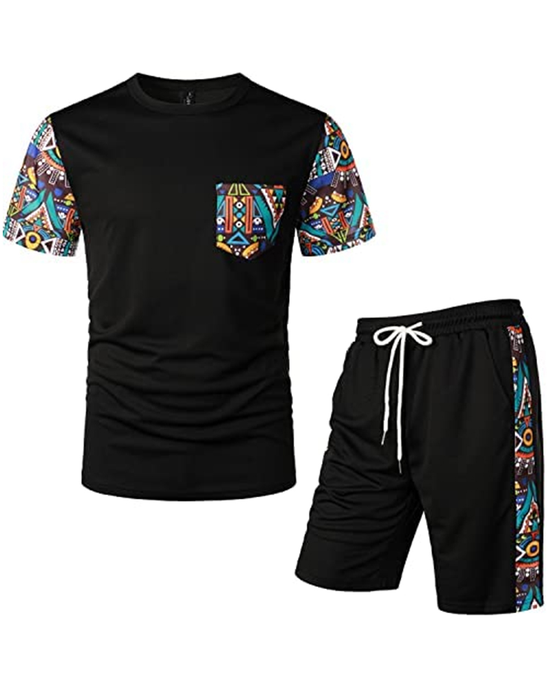 Men's Printed Colorblock T-Shirt and Shorts Set 012