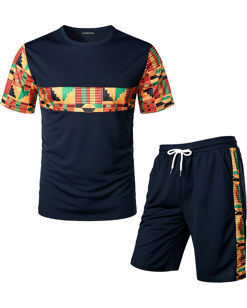 Men's Printed Colorblock T-Shirt and Shorts Set 023