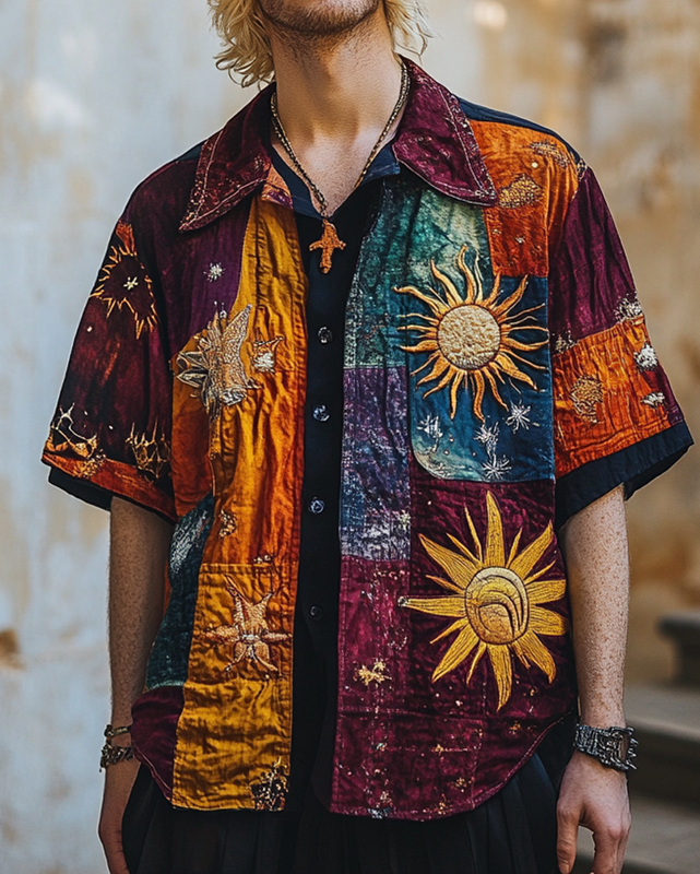 Men's star and moon embroidered rainbow contrast Shirt 52b4