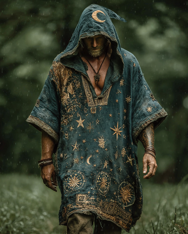 Men's summer vacation star and moon 3D embroidery casual linen hooded kaftan 2487