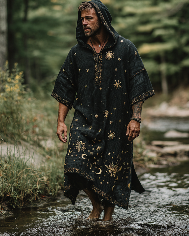 Men's summer vacation star and moon 3D embroidery casual linen hooded kaftan 5082