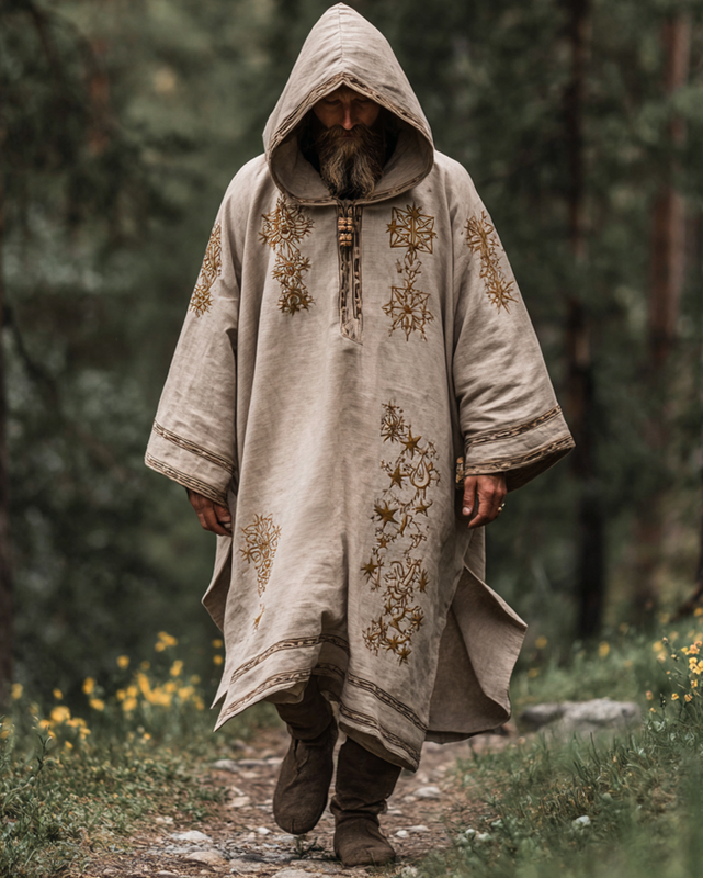 Men's summer vacation star and moon 3D embroidery casual linen hooded kaftan 80a8