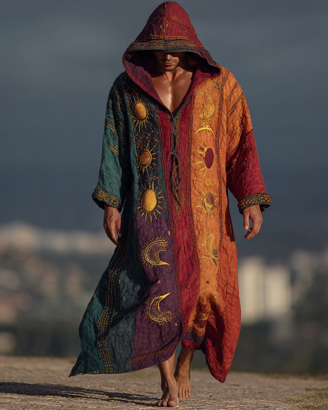 Men's summer vacation star and moon 3D embroidery casual linen hooded kaftan 80f2