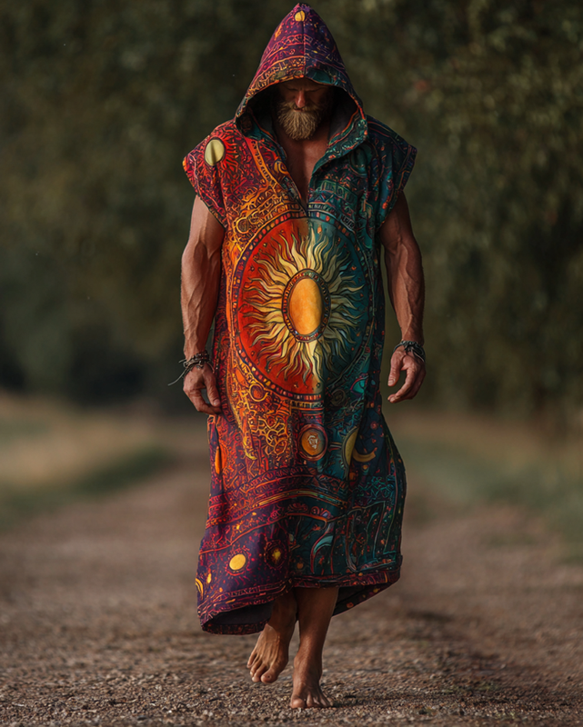 Men's summer vacation star and moon 3D embroidery casual linen hooded kaftan effa