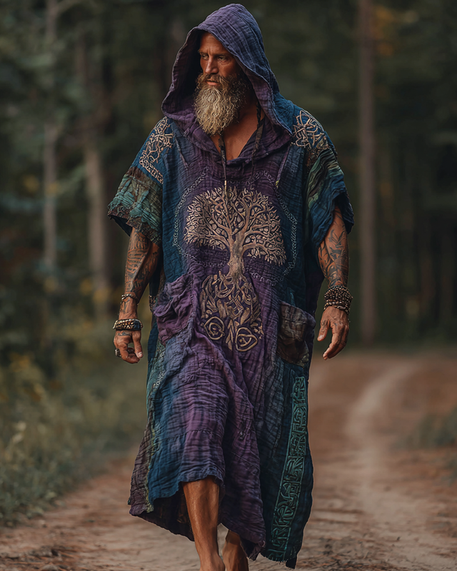 Men's Vacation Viking Themed Tree of Life Stereo Embroidery Casual Linen Hooded Kaftan 70be