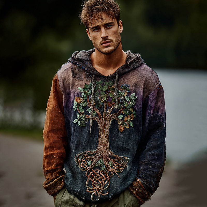 Men's Viking Inspired Tree Of Life With Celtic Knot Art Linen Long Sleeve Hooded T-shirt