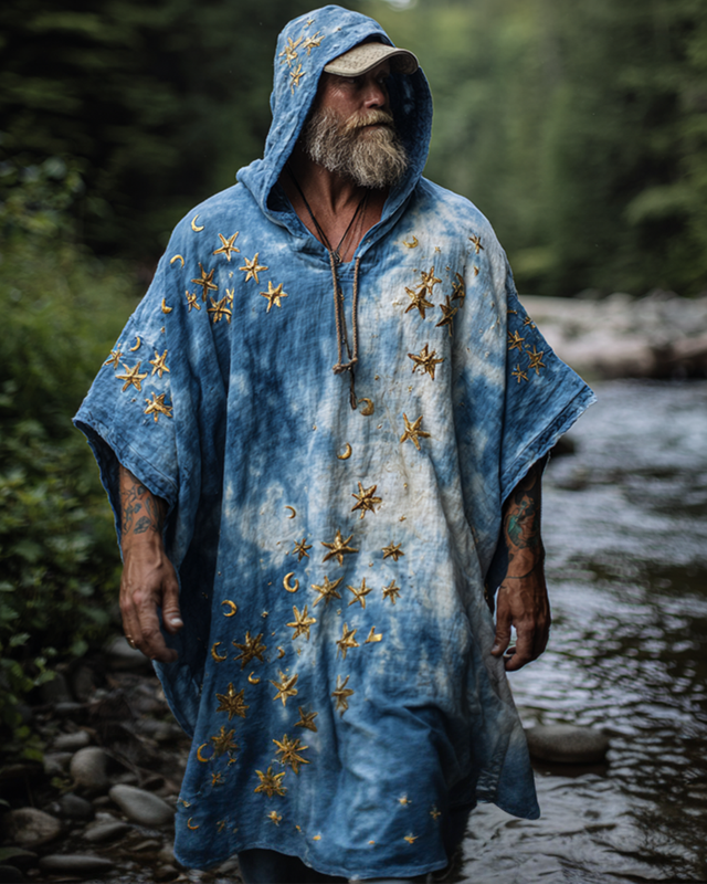 Men's 3D star and moon embroidery tie-dye hooded kaftan 7d71