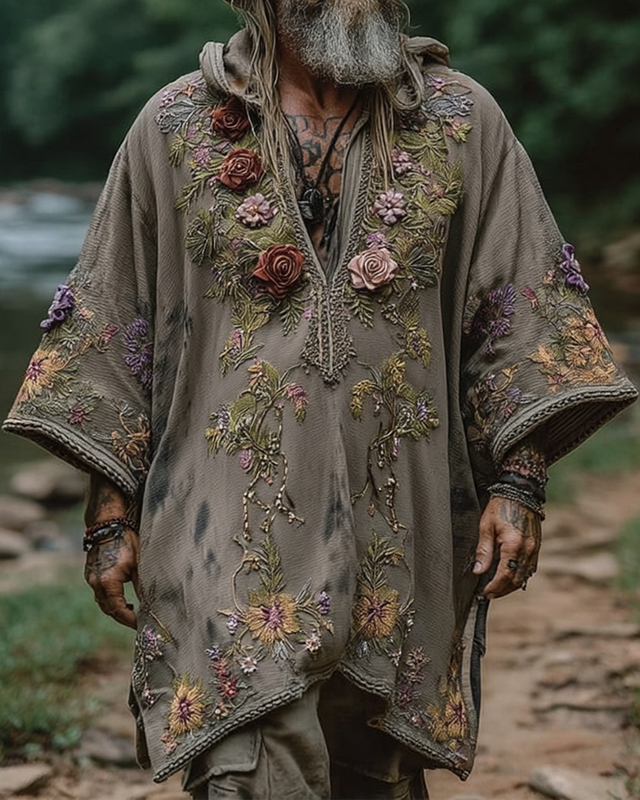 Men's floral 3D embroidered patchwork hooded kaftan d378