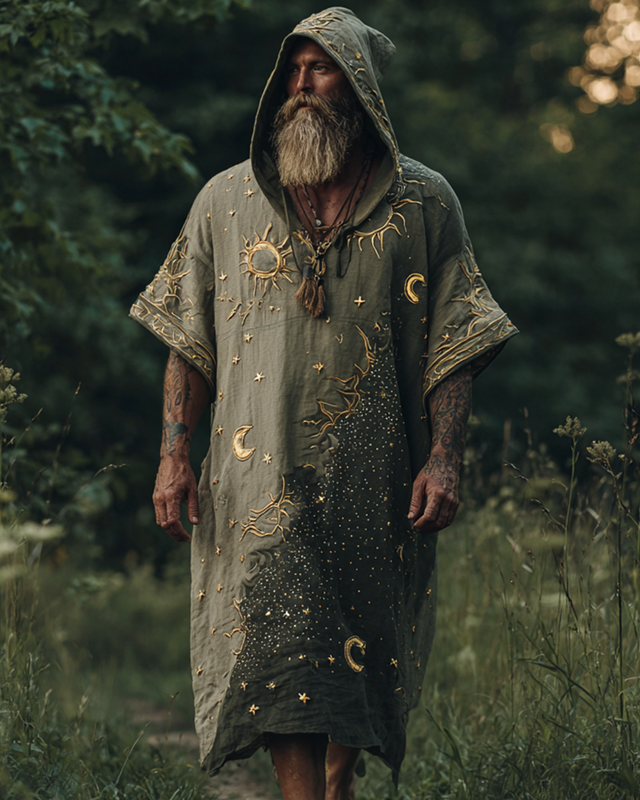 Men's 3D embroidered star and moon celestial bodies, irregular contrast color tie-dye hooded kaftaneda5