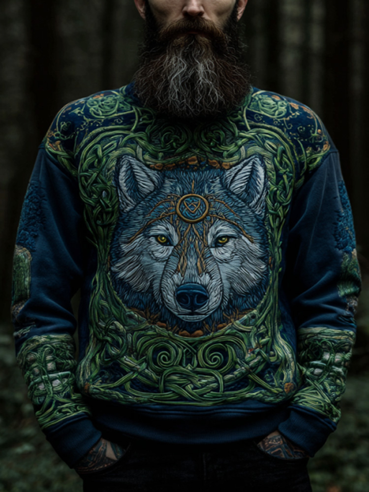 Men's Vintage Viking Wolf Print V-neck Linen Blend Sweatshirt