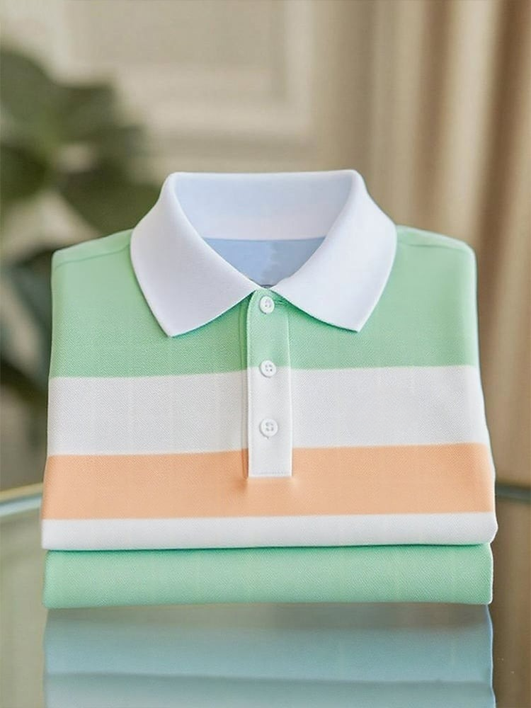 Men's Business Casual Orange and Green Striped Button Short Sleeve Polo Shirt