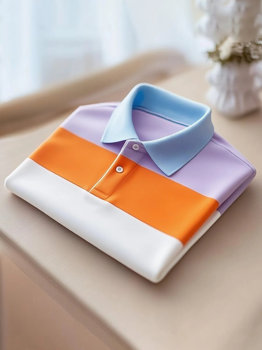 Men's Classic Business Stripe Logo Button Short Sleeve Polo Shirt