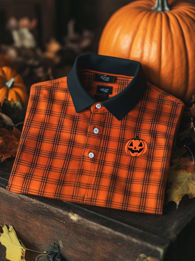 Men's Halloween Plaid Pumpkin Casual Print Polo Shirt