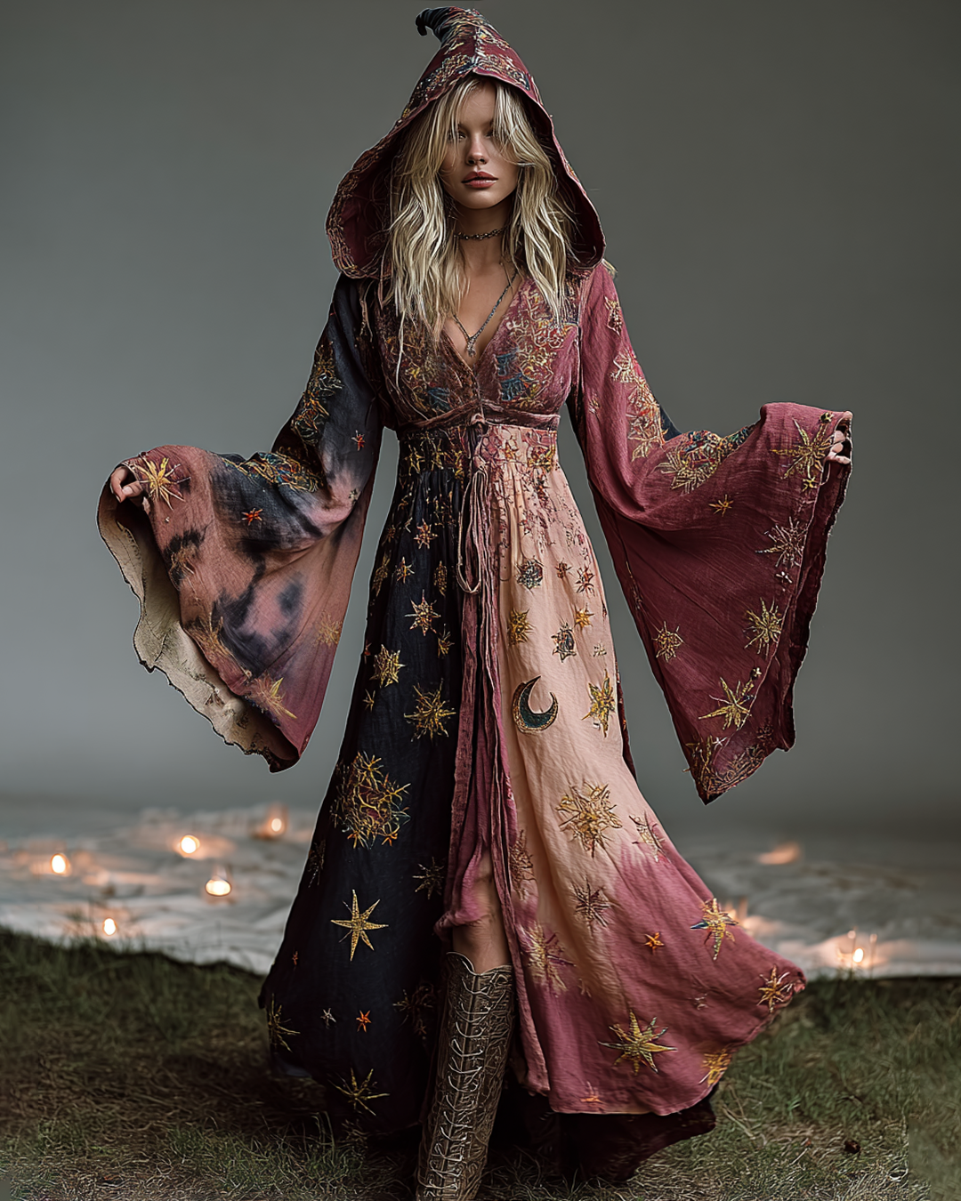 Star And Moon Themed Embroidery Gradient Hooded Witch Dress 4420