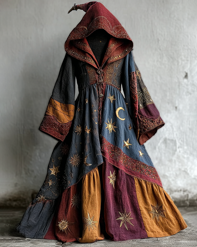 Halloween Themed Star And Moon Embroidery Patchwork Hooded Witch Dress 6c4d