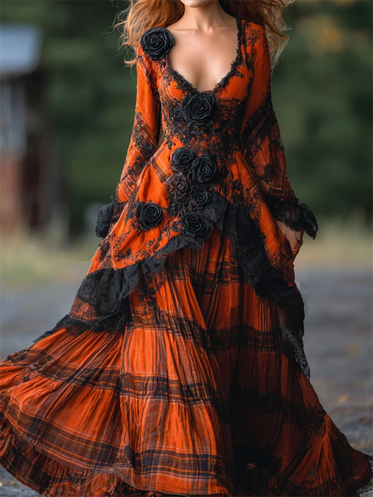 Vintage Gothic Black Roses Lace Trim Plaid Maxi Dress