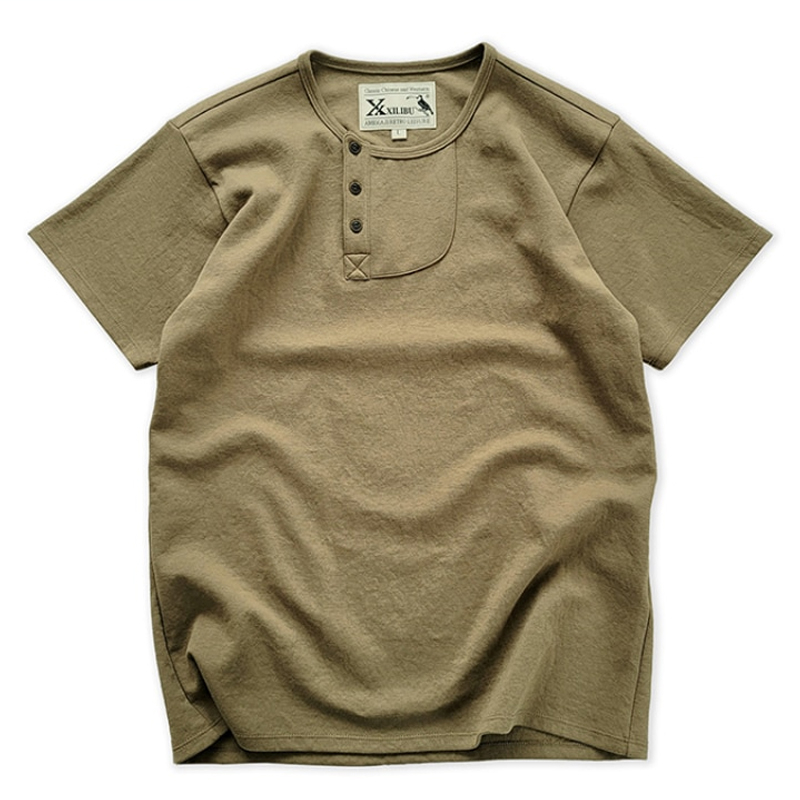 Vintage Khaki Henley Collar Cotton Short Sleeve Casual T-Shirt