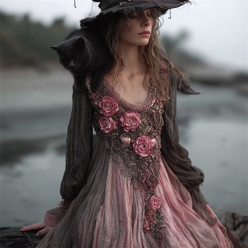 Vintage Witch Pink Roses Glitter Fiber Art Flowy Linen Dress