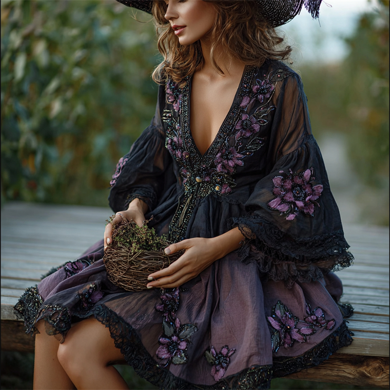 Vintage Witch Purple Floral Glitter Embroidered Flowy Linen Dress