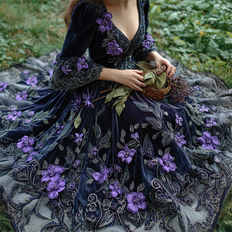 Vintage Witch Purple Flowers Glitter Embroidered Medieval Dress