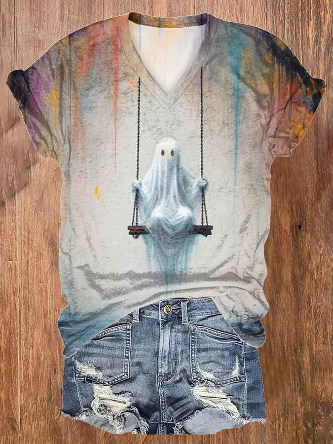 Women's Ghost On Swing Print V Neck T-shirt
