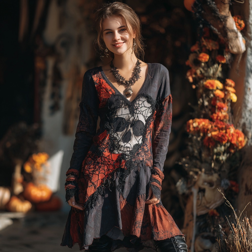 Women's Halloween Skull And Spider Web Pattern V-neck Long Sleeve Dress