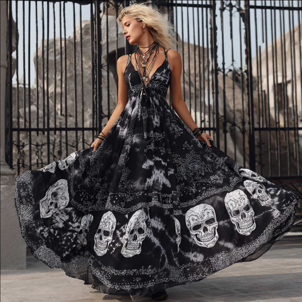 Women's Skeleton Flower Tie-dye Black Floral Print Camisole Dress