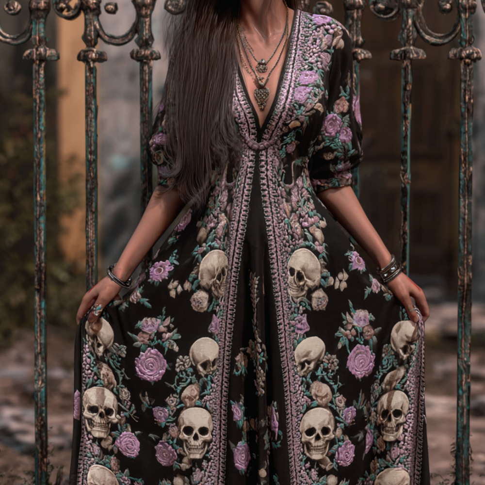 Women's Skull Print Pattern V-neck Long Dress