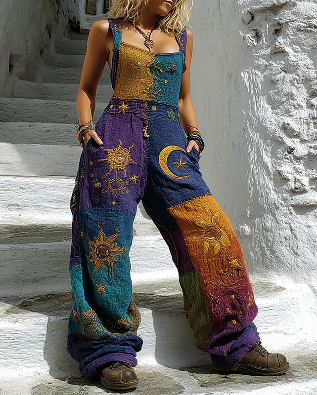 Women's Summer Vacation Stars and Moon Embroidered Linen Patchwork Overalls 656c