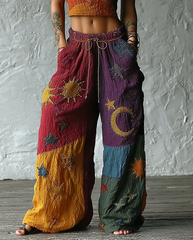 Women's Summer Vacation Star and Moon Embroidered Linen Patchwork Pants 86be