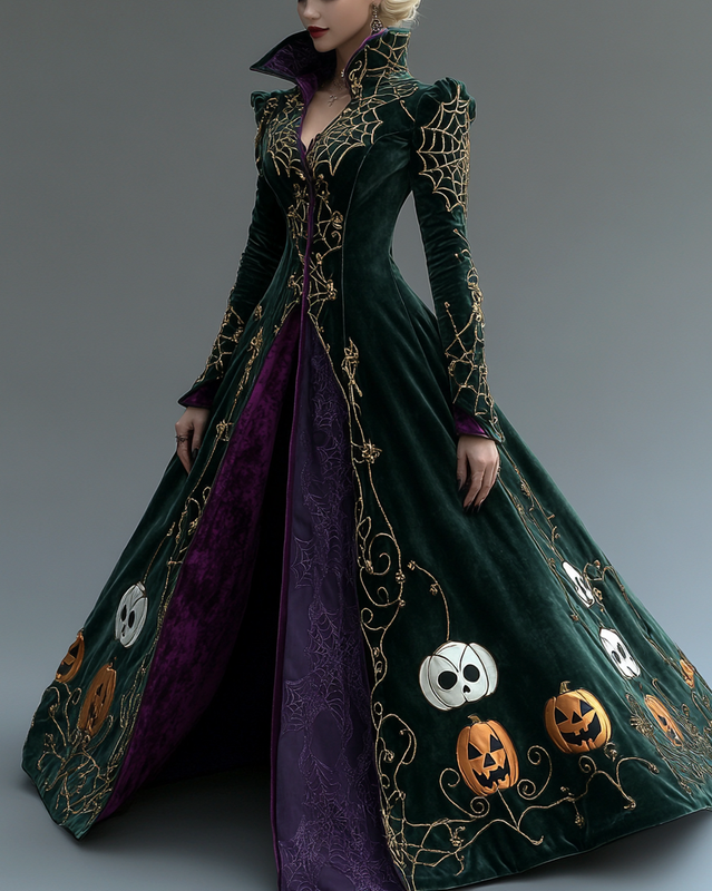 Women's Velvet Slim-Fit Long Swing Elegant Dark Halloween Dress-Green 7221