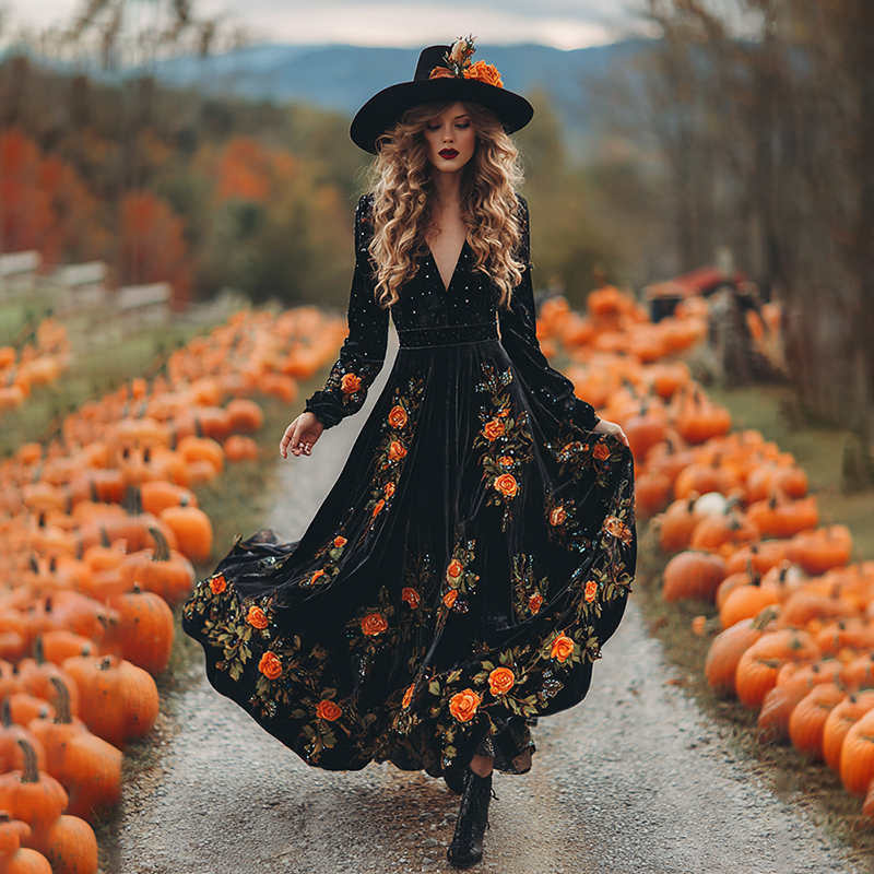 Women's Vintage Halloween Autumn Floral Art Comfy Velvet Maxi Dress
